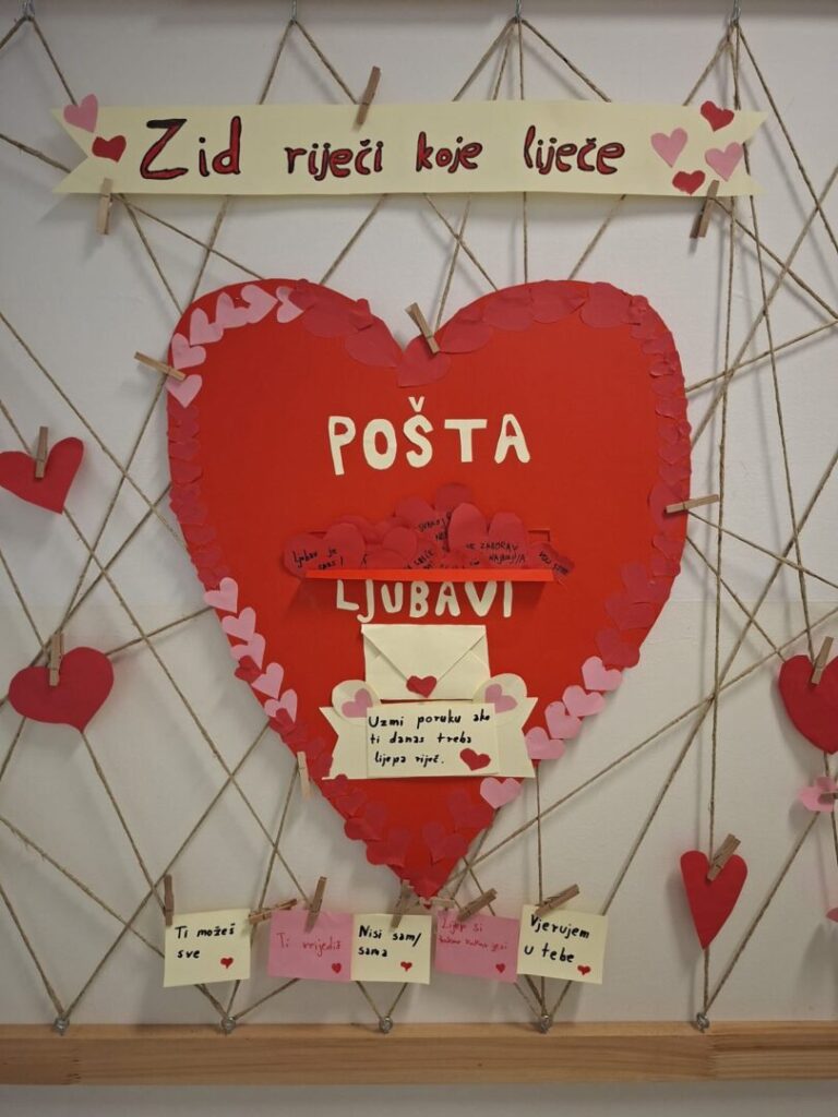 Povodom Valentinova, učenici su izradili veliko srce u obliku poštanskog pretinca u koje su ubacivali motivirajuće i lijepe poruke za svoje prijatelje i ostale učenike škole. Na taj smo način širili ljubav, podršku i pozitivne riječi.