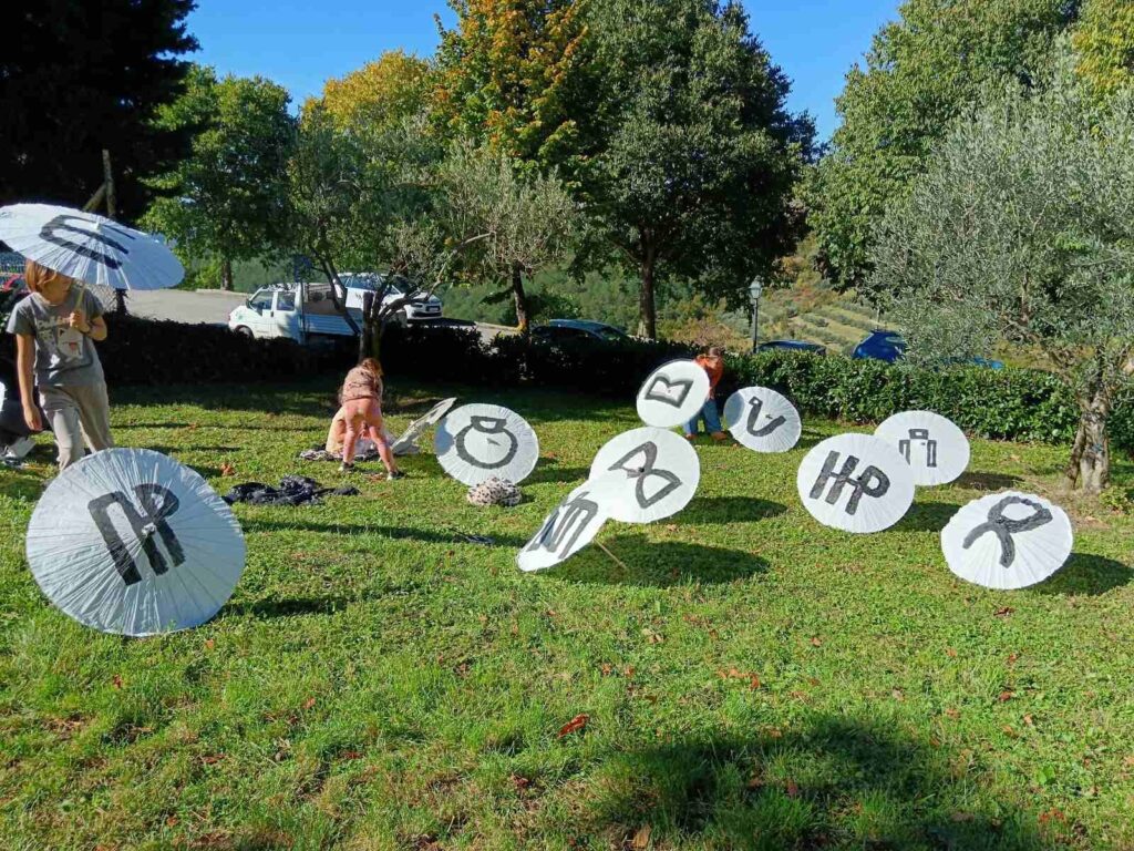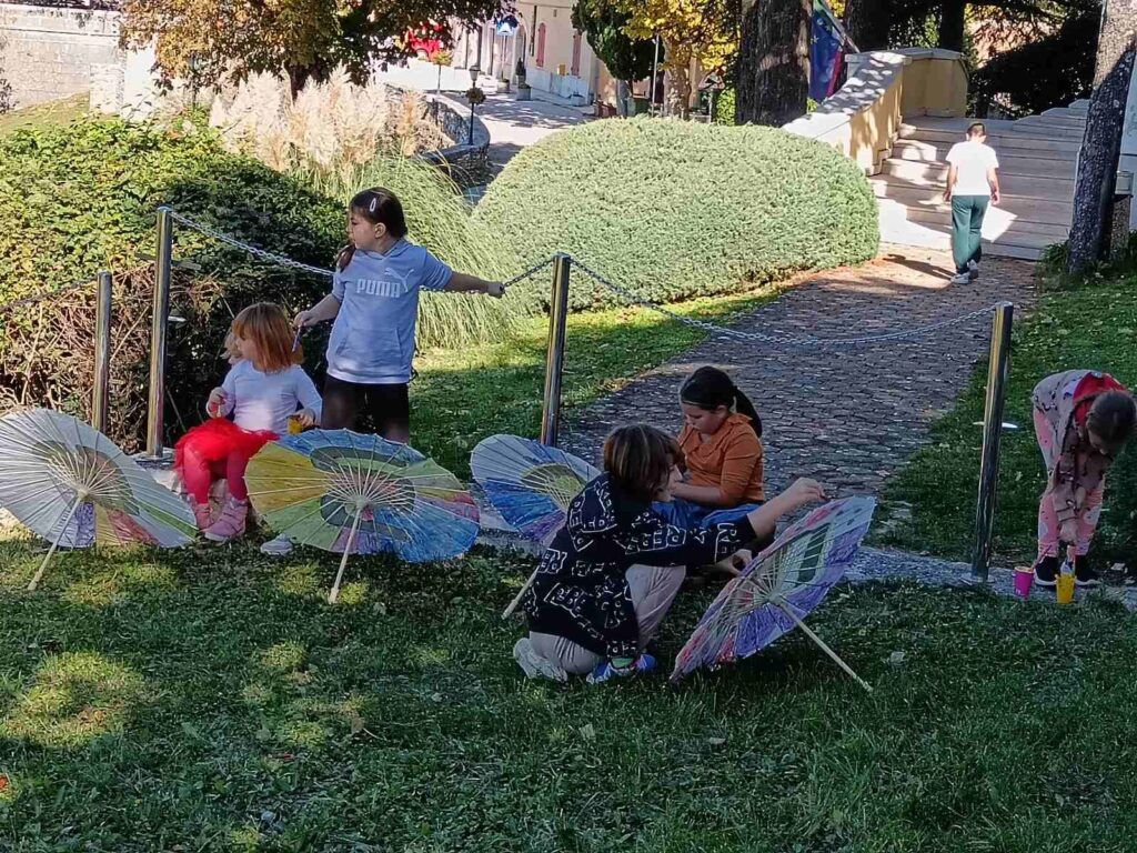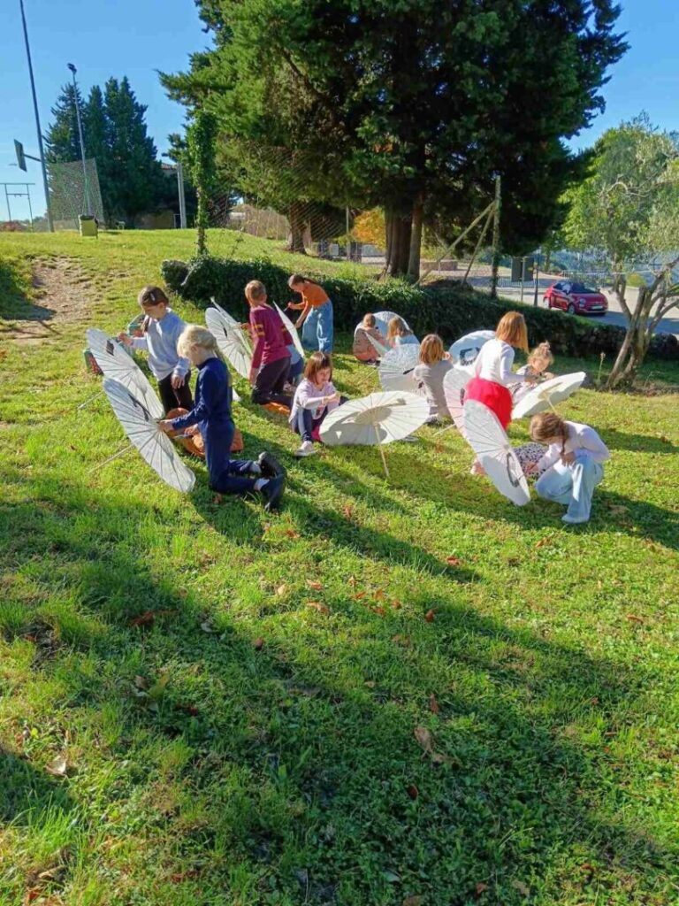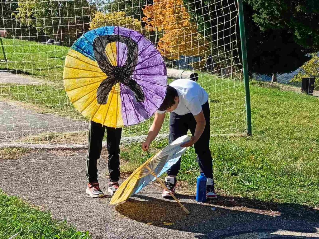 Učiteljice razredne nastave Dina Kotiga, Ivana Kmet, Sunčica Klarić i pedagoginja Antonela Đermadi su u sklopu Dječjeg tjedna za učenike razredne nastave organizirale radionicu oslikavanja papirnatih kišobrana na otvorenom. Učenici su svoje kišobrane ukrasili slovima glagoljice i šarenim bojama. Kroz veselu aktivnost poticali smo kod učenika prepoznavanje glagoljice kao dijela nacionalne kulturne baštine, razvijanje vlastitog umjetničkog stila i mašte te razvoj fine motorike kroz precizno oslikavanje. Kišobranima smo ukrasili strop u holu škole.